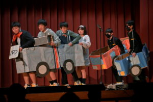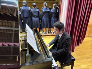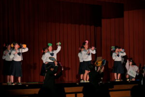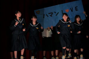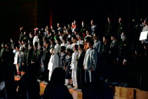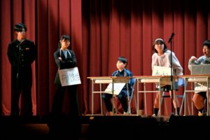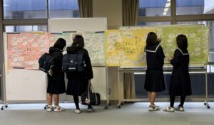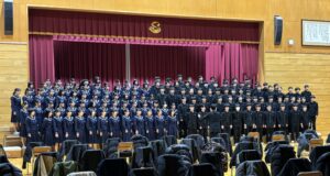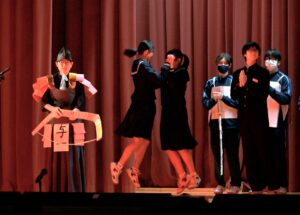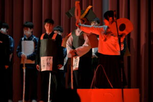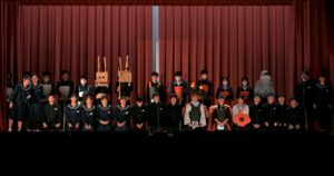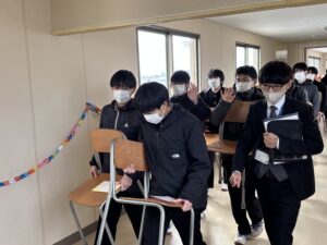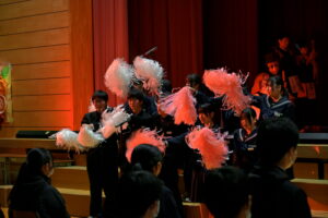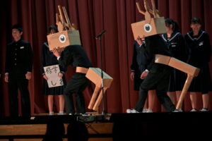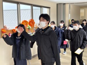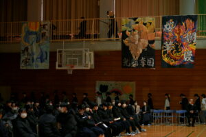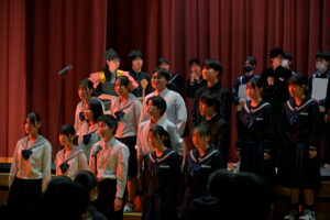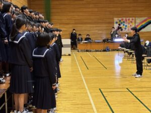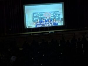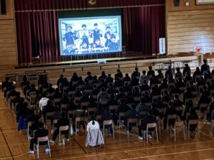 2限~3限に「3年生を送る会」が行われました。感染症対策のため、1、2年生は教室にてリモートでの見学となりました。渡り廊下や体育館がきれいに装飾されたり、体育大会のマスコットが掲示されたりして、3年生に喜んでもらえるようにしました。1、2学年の企画では、これまで練習してきたことを100%出し切り、がんばっていました。各学年とも、名演技あり、切れのあるダンスありで、3年生への感謝の気持ちが十分に伝わっていたと思います。各部の後輩たち、お世話になった先生からの心温まるメッセージは、3年生を感動させました。最後に3年生からお礼として、素晴らしい合唱が披露されました。教室で聴いた1、2年生は、先輩に負けない合唱を創ろうという気持ちになったと思います。終了後、3年生は1、2年生に感謝のメッセージを書き、多目的ホールに掲示されました。1、2年生はこれまでの取り組みを振り返りました。3年生にとって、よい思い出になったと思います。