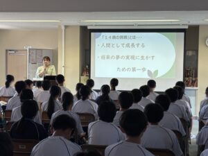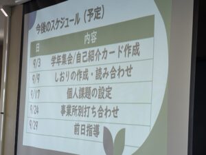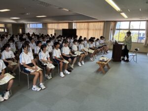 2年生は1学期の終わりから「社会に学ぶ『14歳の挑戦』」に向けて準備を進めてきました。2学期に入ってからは、学年集会や総合的な学習の時間を活用してこの事業の「意義」「目的」「期間」「心構え」等について学び、道徳科の授業では、教材をもとに「礼儀」「マナー」「働く意義」「受け入れてくださる事業所への感謝」等について仲間の意見を聞いたり、話し合ったりして自分の考えを深めました。さらに9月24日(水)には、事業所ごとの最終打合せを行い、出勤時間や服装等について確認しました。この後、9月29日(月)には、公務員、自営業者、会社員等6名の方に清明中学校に来ていただいて、働く意義、やりがい、大変さ等について講演を聴く予定です。「社会に学ぶ『14歳の挑戦』」は、原則9月30日(火)~10月3日(金)のうち3日間です。お世話になる事業所によって活動日時が異なりますので、お子さんにご確認ください。