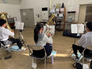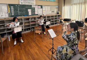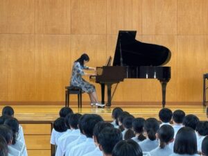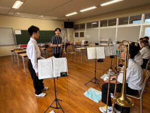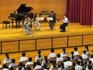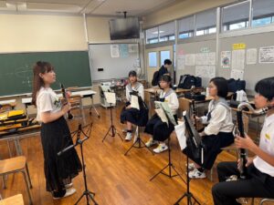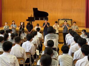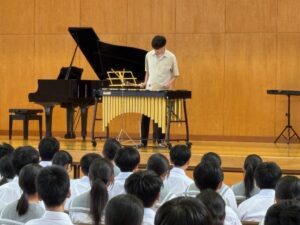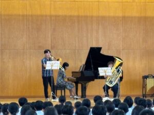 アーティスト in くろべ 青少年交流事業 の一環として、9人の音楽家をお招きして本校の体育館でミニコンサートが開催されました。〈金管アンサンブル+ピアノ〉、〈打楽器ソロ ビブラフォン〉、〈ピアノソロ〉、〈木管五重奏〉の4部構成で行われ、それぞれの楽器による演奏や楽器の特徴の説明がありました。演奏された曲の中には生徒がよく知っているものもあり、生徒は真剣に聴いていました。最後に質問コーナーがあり、「どれくらい練習しますか?」「コンクール等で演奏する時に緊張しないようにするためにはどうしたらいいですか?」等の質問があり、「6時間くらい」「たくさん練習して自信を付けることが大事!」と回答がありました。最後に質問した吹奏楽部の女子生徒は「素晴らしい演奏をありがとうございました。演奏を聴いて感じたこと、皆さんが心がけていらっしゃること等を参考にして、これからの練習に真剣に取り組んでいきたいです。」と締めくくり、ミニコンサートを終えました。放課後には、吹奏楽部のパート別にレッスンの時間を取ってくださり、吹奏楽部員にとって大変貴重な時間となりました。9人の皆さん、素晴らしい演奏とご指導、ありがとうございました。