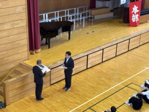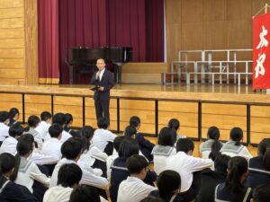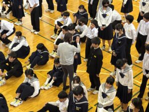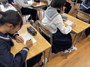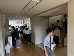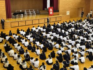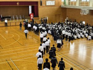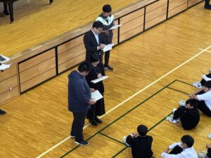 避難場所の体育館では、全生徒が無事であることを確認した後、保健主事や校長先生の話を聞いて、避難訓練を終えました。教室に戻った生徒は、自己評価カードを使って振り返りを行いました。年に数回の避難訓練を通して、いざという時に適切な避難行動が取れるようになってほしいと願っています。