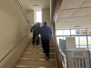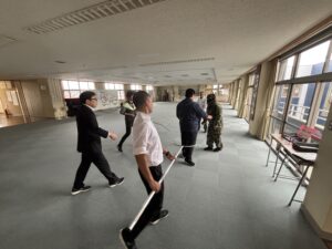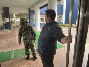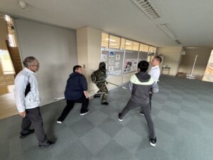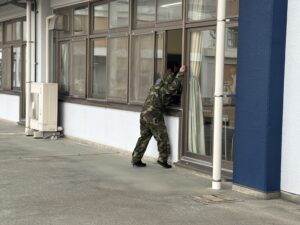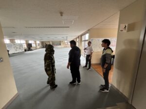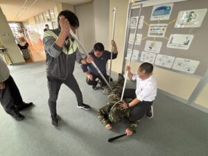 「清明中学校に不審者が侵入したとき」を想定して令和7年度第3回の避難訓練が行われました。はじめに、教室で学級担任から避難訓練の目的、校内に不審者が侵入した際の避難経路や場所等について確認がありました。不審者はグラウンド側のコンクリート通路に現れ、生徒玄関から校舎内に侵入しましたが、多目的ホールで複数の教員により確保されました。この間、教員は「不審者に声をかける」「校内電話で職員室に連絡する」「異変を察知し、防火扉を閉める」「緊急放送に従い、生徒を体育館に誘導する」「不審者確保に向かう」等の活動を連携して行いました。