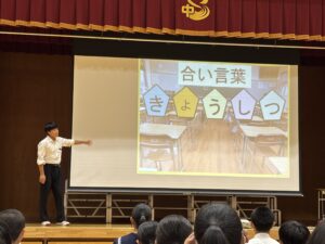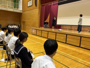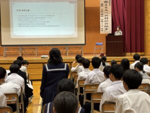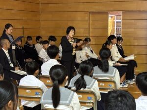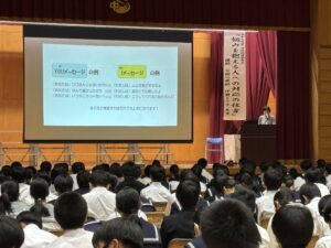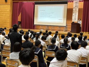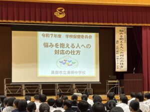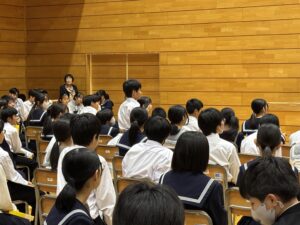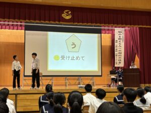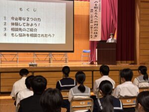 公認心理師の伊藤えり子先生を講師としてお迎えし、「悩みを抱える人への対応の仕方」をテーマとして学校保健委員会を開催しました。始めに生徒会保健委員会のメンバーがテーマに関わる寸劇を行いました。続いて伊藤先生は、テーマに関連して今必要な2つの力として「心の危機に気付く力」と「相談する力」の2つを挙げた上で、ストレスと脳の関係を説明したり、スクールカウンセラーや相談機関を紹介したりしました。また、バウンダリーやアサーションといった専門用語を解説するとともに、相手に対するメッセージの出し方を教えてくださいました。質疑応答では、「Iメッセージ(アイメッセージ)を出しても相手に伝わらなかったときはどうしたらよいですか。」「この仕事(公認心理師)をしてよかったなと思うのはどんなときですか。」等の質問が出て、伊藤先生は「メッセージの出し方は時と場合を考えることが大切です。」「カウンセリングをした後、よくなりましたとかいい方向に進んでいますといった連絡をもらったときはうれしい。」と丁寧に答えてくださいました。最後に生徒代表が謝辞を述べて学校保健委員会を終えました。その後、生徒は教室に戻り、感想を記入したり、学級担任とともに印象に残ったことを話し合ったりしました。生徒会保健委員会の皆さん、寸劇の準備等、お疲れ様でした。また、参観してくださった保護者の皆様、ありがとうございました。
