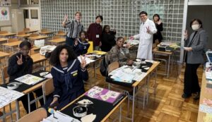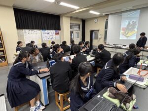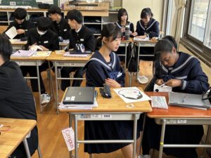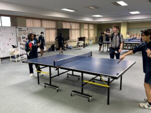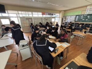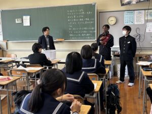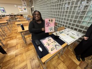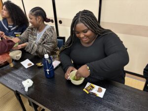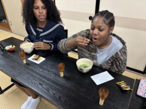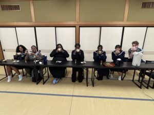 姉妹都市交流研修事業としてメーコン(アメリカ合衆国)から来日しているメンバーのうち5名が、27日(月)、28日(火)の2日間、清明中学校を訪問し、授業に参加したり、茶道や書道といった日本文化に触れたりして、生徒や教職員と交流を深めました。清明中学校の生徒は、授業や給食の時間に、笑顔でコミュニケーションを取ろうとがんばっていました。放課後には部活動に参加する姿も見られ、楽しいひとときを過ごすことができました。5名の皆さん、お元気で!
