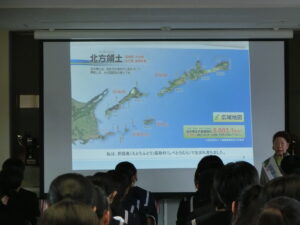 後半の根室高校北方領土根室研究会の講演では、北方領土の歴史、自然、四島の面積等、基礎的な知識や、不法占拠の経緯、北方領土問題の現状等をクイズを交えながら分かりやすく教えていただきました。