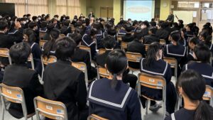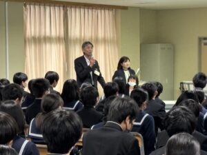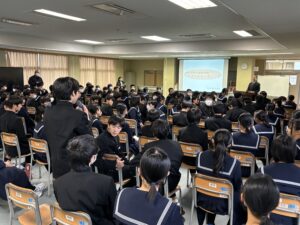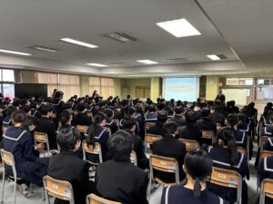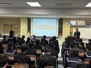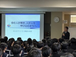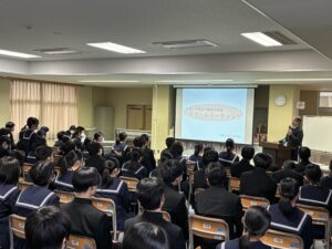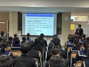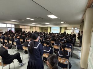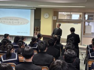 黒部市長と中学生が意見交換する「スクールミーティング」が、本校の2年生を対象に開催されました。この行事は「市の行政に親しみをもってもらうとともにふるさとである黒部への理解を深めてもらうこと」を目的に毎年開催されています。はじめに武隈義一市長が黒部市の施策を説明しました。次に質疑応答があり、「通学路に暗くて危険な箇所があるので照明を設置ほしい」「閉校となった学校の利活用の方法は」「部活動の大会等にスクールバスを利用することはできないのか」等の質問や要望を市長に直接伝える機会となりました。このスクールミーティングが、黒部市の行政や市長の役割に生徒が関心をもつきっかけになればよいと思います。終了後、生徒は教室で振り返り用紙に感想等を記入しました。武隈市長には、ご多用の中、来校いただきありがとうございました。