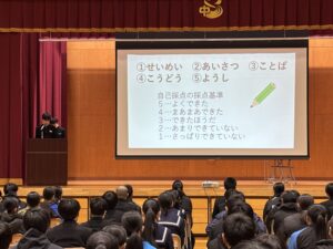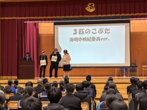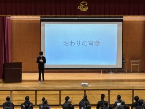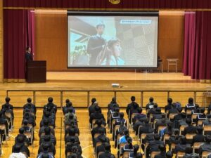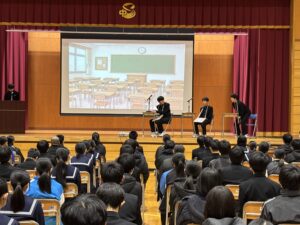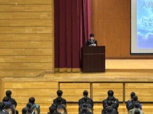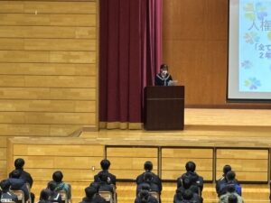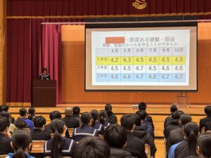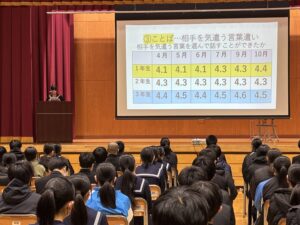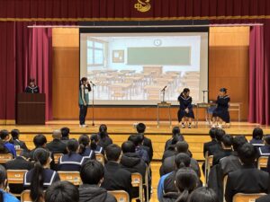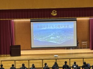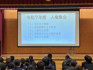 「身近な人権問題について考え、一人一人がもつ権利を理解することを通して、自分を大切にするとともに、周りの人も大切にしようとする意欲を高める」ことねらいとして、令和7年度の人権集会が開催されました。この集会は、人権週間に合わせて毎年開催されており、今年は黒部市の人権擁護委員や黒部ライオンズクラブの方々を来賓としてお迎えしました。集会では始めに校紀委員がアンケート調査の結果発表とその考察、思いやりに関する寸劇の発表等を行いました。次に代表者による人権作文の発表がありました。最後に黒部市子どもの権利宣言を校紀委員が読み上げ、集会を締めくくりました。閉会後、黒部ライオンズクラブの方が「ヘアドネーションと献血」についてその意義を説明したり、ニュース映像を紹介したりしてヘアドネーションと献血への理解と協力を求めました。集会の企画運営に携わった生徒会校紀委員会の皆さん、ありがとうございました。