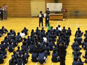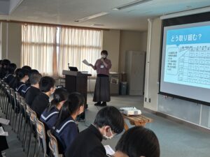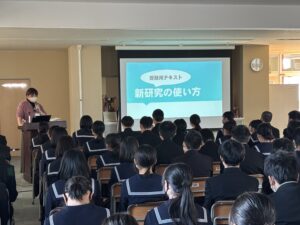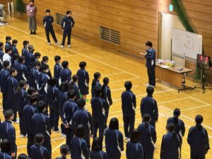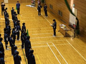 12月16日(火)の4限に行われた学年集会では、学年主任から3学期に開始する受験に備えた補助教材(5教科)の内容や進め方、提出のルール等についての説明がありました。また、「授業での課題、週末課題に加えて定期的に提出することになるので、計画的に進めることが大事です。」「冬休みのうちにスタートしてもよいので、がんばりましょう。」と励ましの言葉がありました。