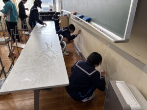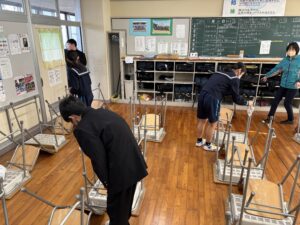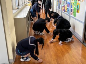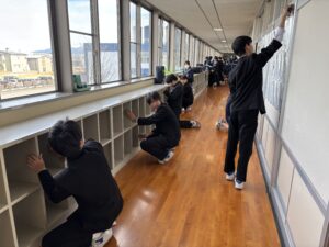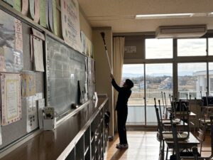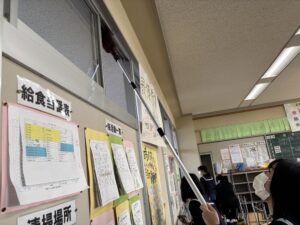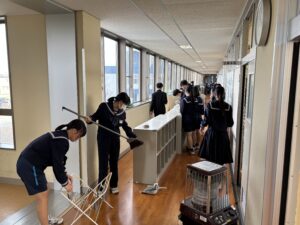 大掃除は、教室内や教室前の廊下を中心に行われました。生徒は廊下の窓の蜘蛛の巣を払ったり、ロッカーを動かして埃を取ったりするなど、日頃なかなかできない箇所の掃除に協力して取り組みました。大掃除の後は、通常の清掃場所の掃除を行い、すっきりした気持ちで1日を終えることができました。