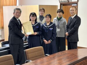 清明中学校では生徒会ボランティア委員会が中心となって令和7年度「赤い羽根共同募金」に参加し、15日(木)に生徒会ボランティア委員会の委員長と副委員長が、集まった募金を校長室で黒部市社会福祉協議会の代表の方にお渡ししました。代表の方からは「協力してくださり、ありがとうございます。お預かりしたお金は、富山県の共同募金会を通じて、支援を必要とする方々のために遣わせていただきます。」とお言葉をいただきました。募金に協力してくださった皆さん、ありがとうございました。