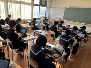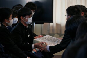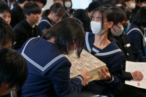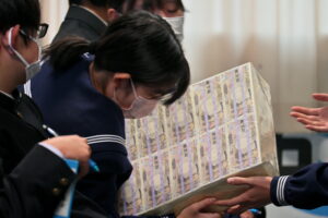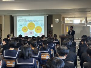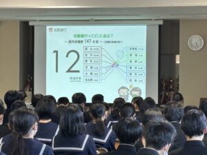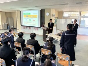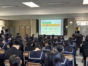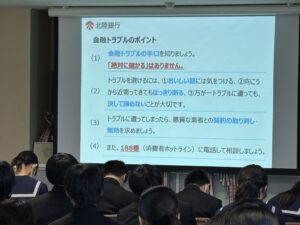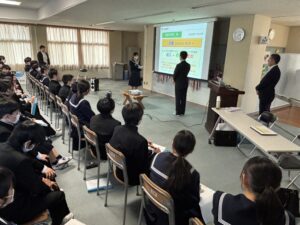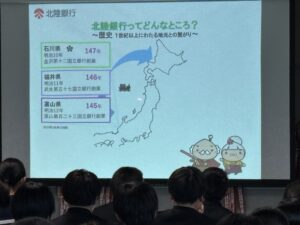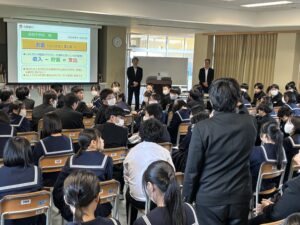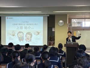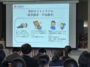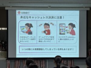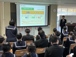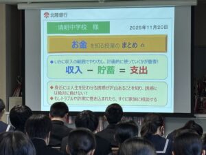 「社会に学ぶ『14歳の挑戦』」の事後学習の締めくくりとして、「お金を知る講演会」が開かれ、北陸銀行黒部支店 統括副支店長の上田裕介さんを講師としてお迎えし、お金の役割や重要性、銀行の仕組み、銀行とお金の関係等について、1億円の束の重さを体験したり、クイズに答えたりしながら、楽しく分かりやすく学ぶことができました。金銭トラブルの話では、税務署や運送会社を装った実際の通知画面を紹介して説明があり、身近なところにも罠が潜んでいることを再認識することができました。質疑応答では、「なぜ北陸銀行に就職しようと思ったのですか?」「有害なサイトと正式なサイトを見分ける方法は?」等の質問に対して、上田さんは自分の経験や具体例を交えて丁寧に答えてくださいました。最後に代表の生徒が「お金は計画的に使わなければいけないと思いました。収入-貯蓄=支出という公式を意識しながら生活していきたいです。」と謝辞を述べ、講演会を終えました。終了後、生徒は教室に戻り、タブレットを使ってアンケートに答えたり、学習プリントに感想を記入したりしました。上田さん、ご来校いただいた北陸銀行の皆様、ありがとうございました。