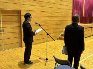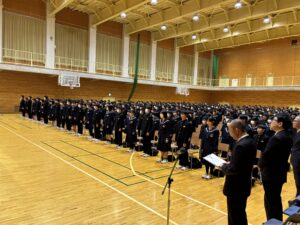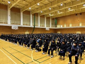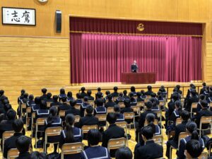 始業式では、式辞で校長先生が「2年前の能登半島地震で私たちは日頃の備えと困ったときに支え合うことを学びました。この学びは校訓「鷹志」に込められた「共に支え合い、粘り強く努力する」と通ずることです。学校生活も同じく、お互いに支え合うことが大切です。また、相田みつをさんの『花をささえる枝 枝をささえる幹 幹を支える根 根は見えねぇんだなあ』にあるように、見えないところでの各自の努力が力になります。共に支え合うことと粘り強く努力することが皆さんの成長に繋がると考えます。3学期の皆さんのがんばりを応援しています。」と生徒を励まし、3学期がスタートしました。続いて生徒指導主事から「冬季の交通安全、駐車場への自家用車の出入り、乗り降りのマナー、防寒具、SNSについての注意事項」等について話がありました。