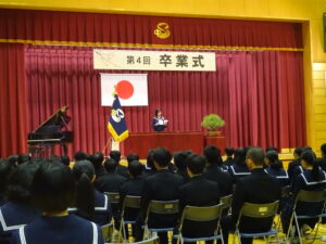3月14日(木)、第4回卒業式が行われ、清明中学校を184名が巣立っていきました。朝までは、もらった卒業アルバムにメッセージを書き合って賑やかでしたが、卒業式が始まると落ち着いた態度で臨んでいました。なかでも、3年生が歌った「群青」は圧巻の合唱で、来賓・保護者から思いがけず拍手が起こりました。式後は学級で最後の学活を行い、担任からお祝いの言葉や生徒からの感謝の言葉があり、名残を惜しんだようです。門出の集いでは、1、2年生が花道を作り、3年生を送り出しました。