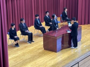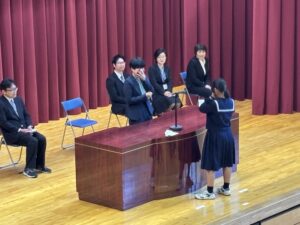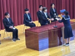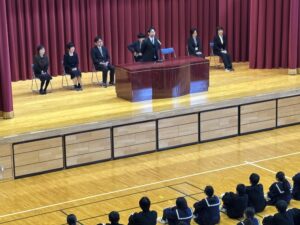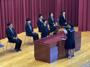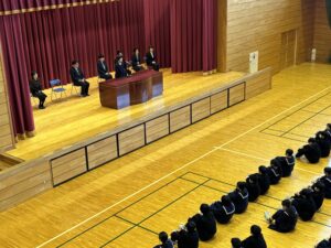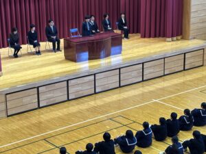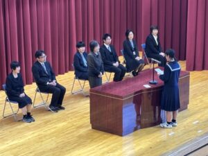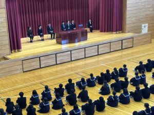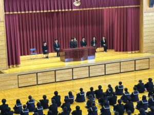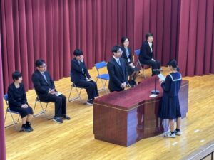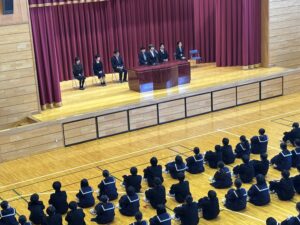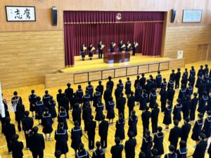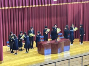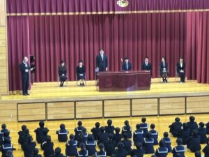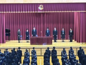 投稿日: 2026年4月1日令和7年度 退任式・離任式(20260327) 退任式・離任式が行われ、退任される2名、ご栄転される5名の教職員の皆さんとお別れしました。7名の教職員の皆さんのご健康とますますのご活躍をお祈りします。これまでありがとうございました! 1 退任・転出の教職員の皆さん 2 退任・転出する教職員の紹介(校長) 3 退任の挨拶 4 退任の挨拶 5 転任の挨拶 6 転任の挨拶 7 転任の挨拶 8 転任の挨拶 9 転任の挨拶 10 感謝の言葉(生徒代表) 11 感謝の言葉(生徒代表) 12 感謝の言葉(生徒代表) 13 感謝の言葉(生徒代表) 14 感謝の言葉(生徒代表) 15 感謝の言葉(生徒代表) 16 感謝の言葉(生徒代表) 17 花束贈呈(生徒代表) 18 校歌合唱! 19 皆さん、お元気で!(式後の廊下で・・・)